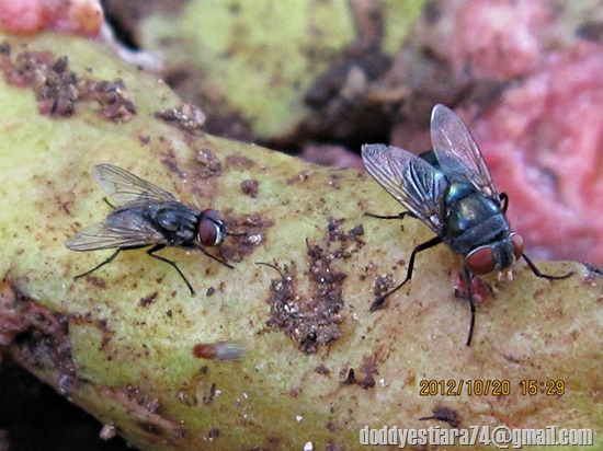 Coba perhatikan 2 foto dibawah ini: Lalat hijau dengan lalat rumah sedang bersama-sama menikmati jambu busuk yang jatuh dari pohonnya. Perhatikan bentuk kepala dan mata dari lalat hijau yang berbeda antara foto pertama dengan foto berikutnya….sssttt…ternyata bentuk mata dari si lalat rumah juga berbeda ya antara foto pertama dengan foto berikutnya